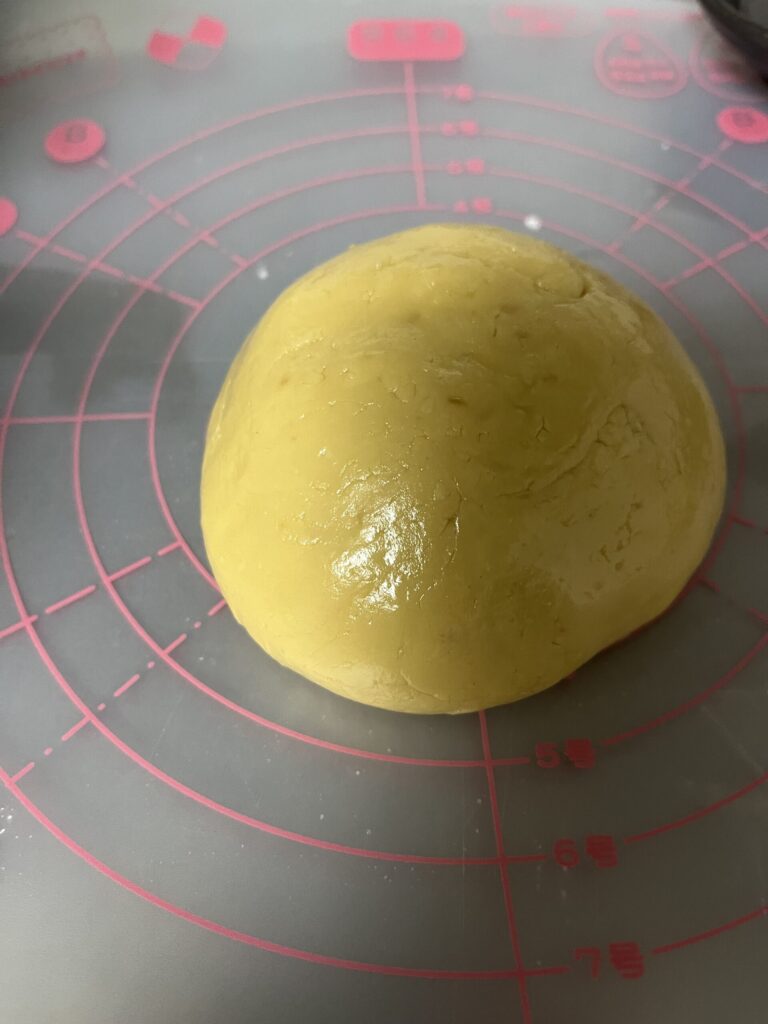 だんだんとまとまってきます。 - まとまったら、手少し油を付けてツルンと丸めて作業台の