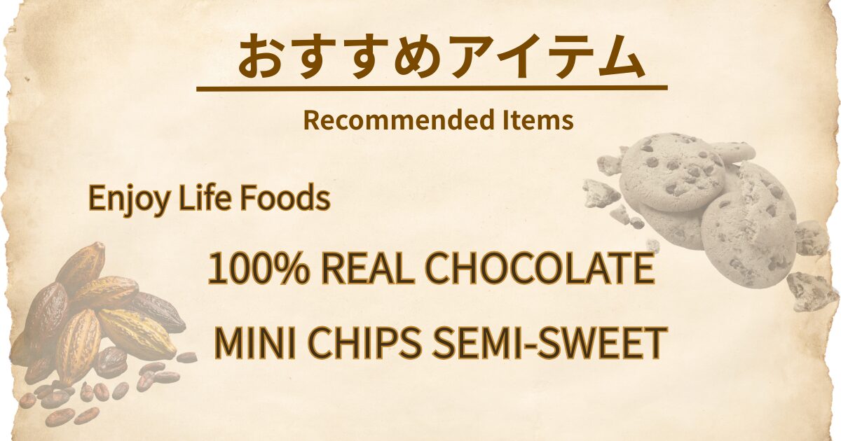 Enjoy Life Foodsの「100%リアルチョコレート ミニチップス セミスイート」は、乳製品・ナッツ・グルテンなどの主要アレルゲンを使用せずに作られたチョコチップです。