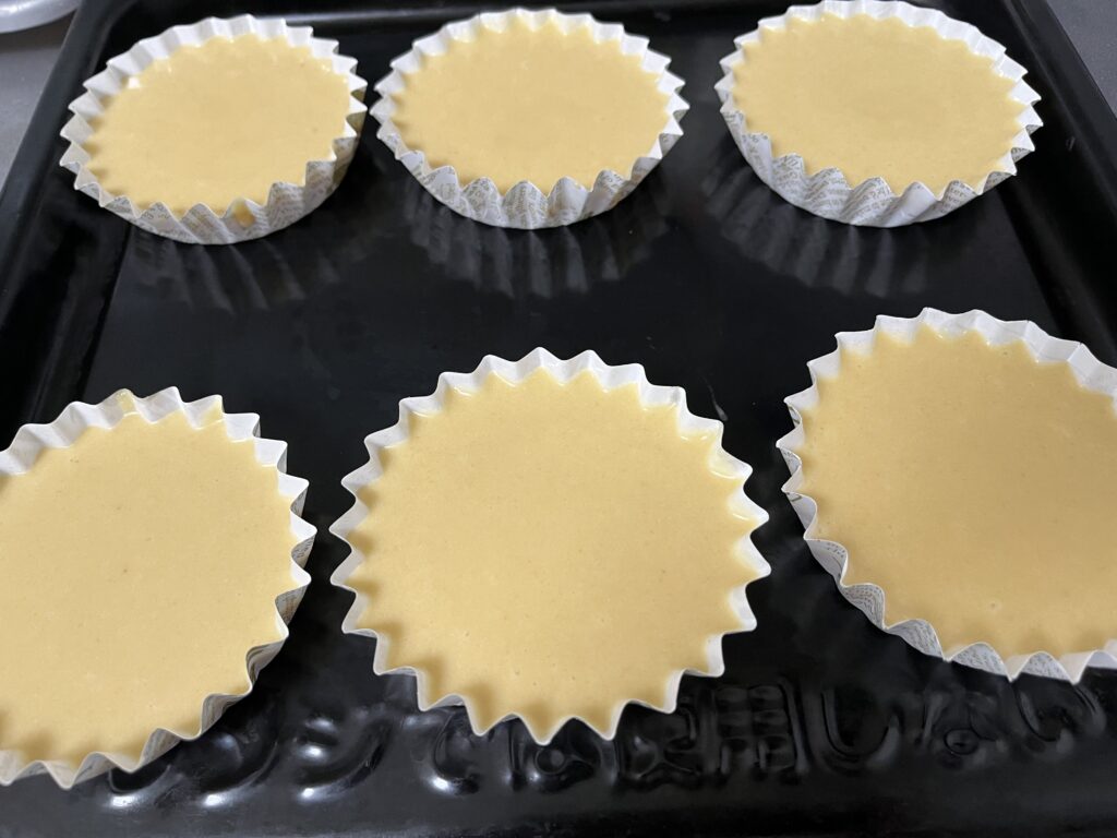 1. マドレーヌ形に生地を均等に入れます。