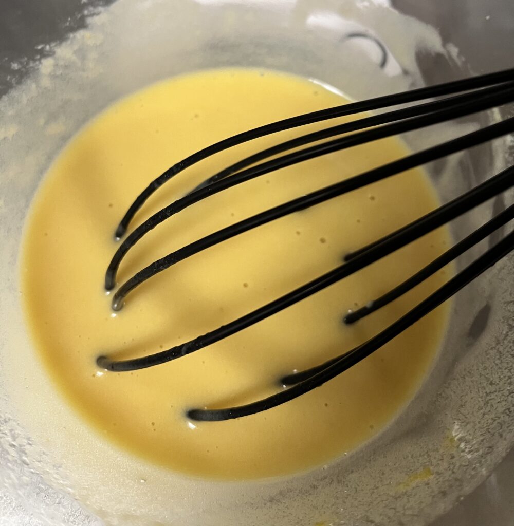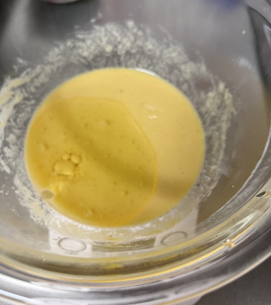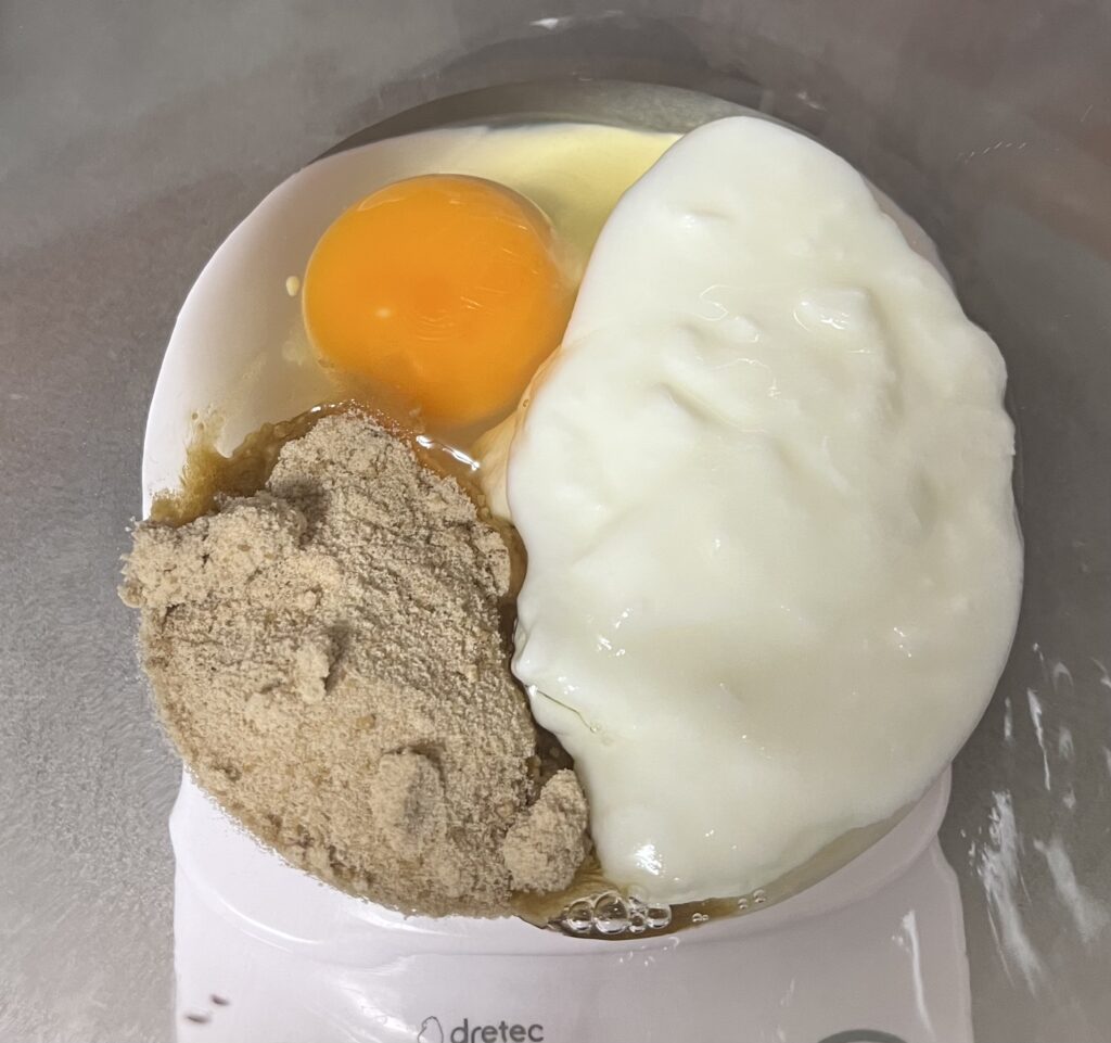 - ボウルに卵・甜菜糖・ヨーグルト・はちみつを入れ、泡だて器でよく混ぜ合わせます。