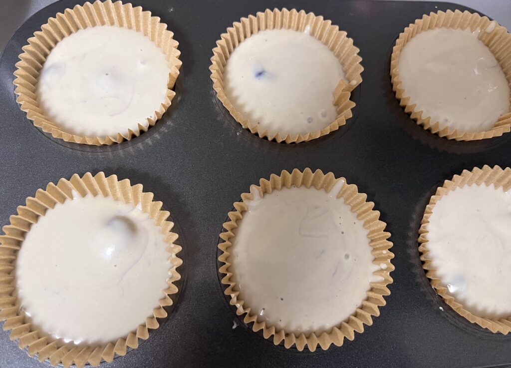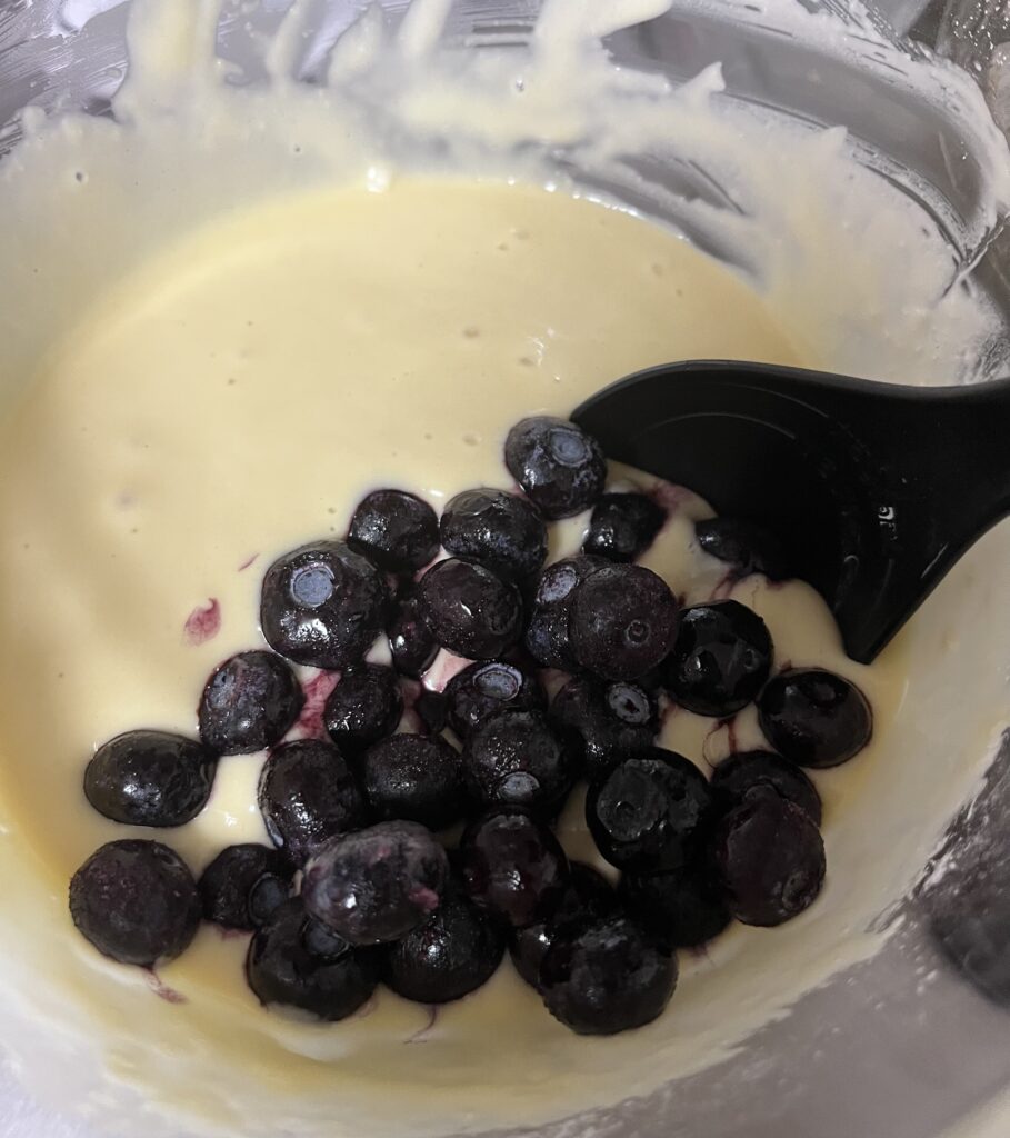 - 生地にブルーベリーを加え、軽く混ぜ合わせます。