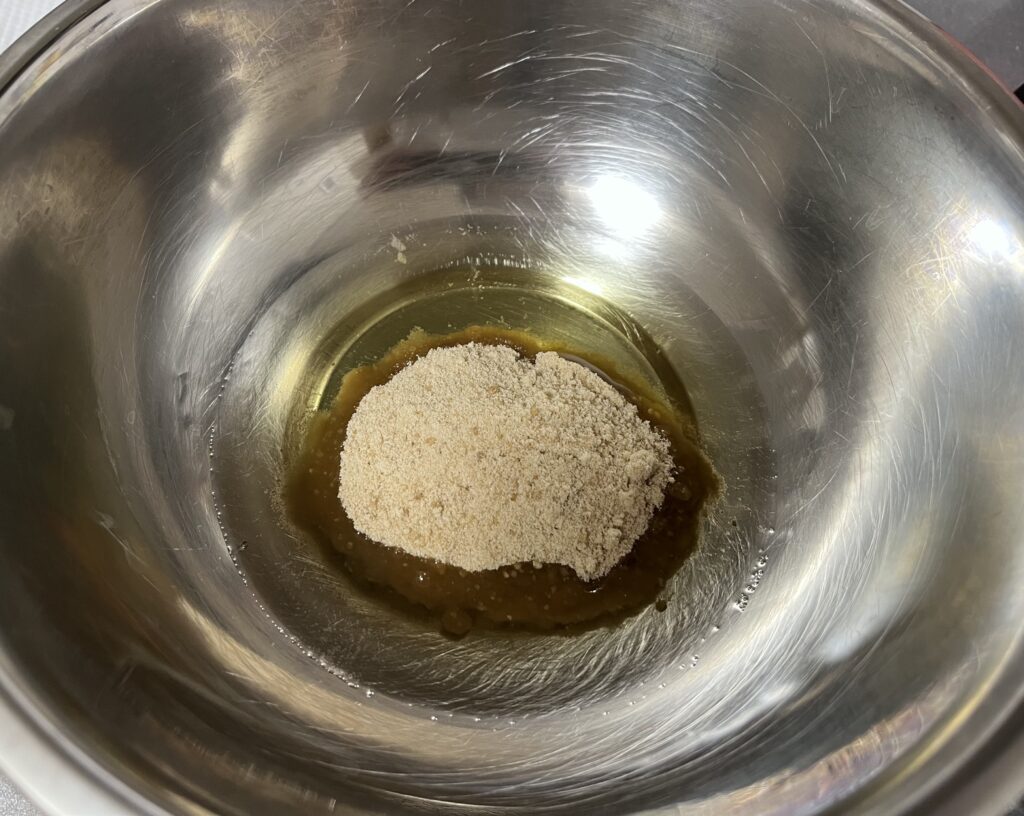 - 米油に甜菜糖を加えて、泡だて器でよく混ぜます。